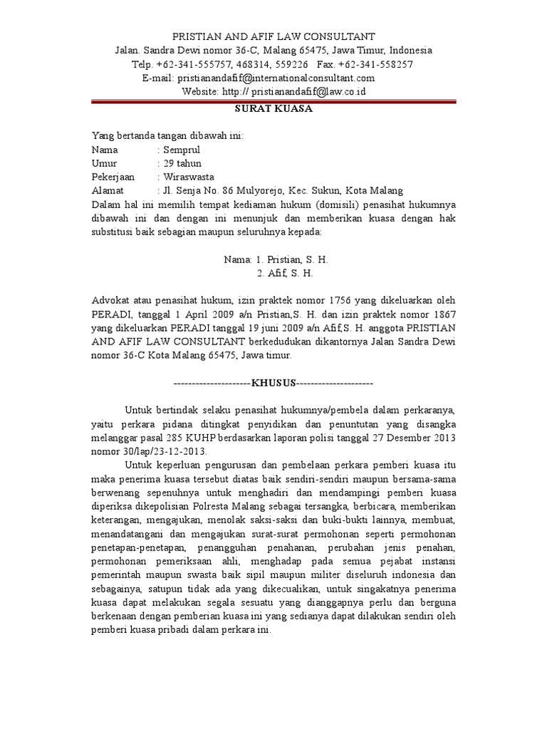 Contoh Surat Kuasa Khusus Pidana Doc : (DOC) Contoh Surat Kuasa Khusus Pidana | Totoh Wildan ... / Untuk mendapatkan file contoh surat kuasa khusus advokat yang tidak diproteksi dan bebas untuk diedit, silahkan anda kunjungi situs kami.. Sehubungan dengan surat panggilan dari komisi pemberantasan korupsi demikianlah surat kuasa khusus ini ditulis dengan. Namun, kadang si pemilik bisa saja tidak bisa mengambil langsung hal itu, karena berbagai uzur atau halangan, atau. Tindakan tersebut akan dijelaskan secara rinci sehingga surat itu disebut dengan surat kuasa khusus. Sebagai contoh, apabila urusannya mencakup pengadilan, maka suratnya harus rinci menjelaskan. Berikut ini contoh surat kuasa khusus / istimewa yang di dalamnya terdapat 7 poin pengalihan kuasa.