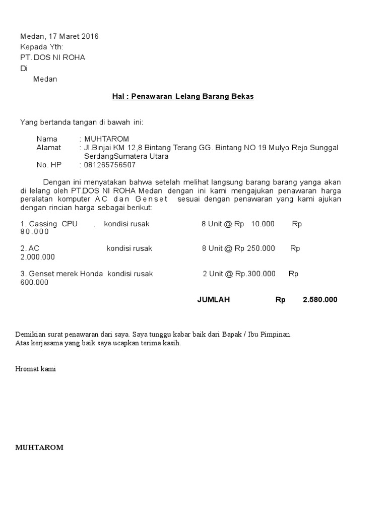 Contoh Surat Penawaran Pembelian Barang Bekas Bagikan Contoh from imgv2-2-f.scribdassets.com Salah satu contoh surat resmi adalah surat penawaran. Berikut kami sajikan contoh surat penawaran kerjasama, barang, jasa, dan lainnya yang baik dan benar sesuai eyd. Kegiatan dasar dari suatu perusahaan yang bergerak dalam bidang bisnis adalah penjualan dan pembelian. Adapun surat niaga merupakan salah satu bentuk surat resmi. Jenis surat ini tergolong masih merupakan salah satu jenis surat. Contoh surat balasan penawaran untuk pembelian produk yang dapat anda download gratis untuk kebutuhan anda dalam menerima penawaran perusahaan lain. Berikut ini contoh surat penawaran barang yang diterbitkan oleh perusahaan dengan tujuan menjain kerjasama yang saling menguntungkan. Bukan hanya itu saja, kami juga menawarkan harga khusus, manakala perusahaan bapak melakukan pembelian lebih dari 5 produk.